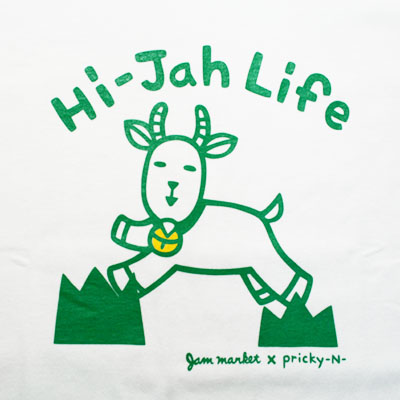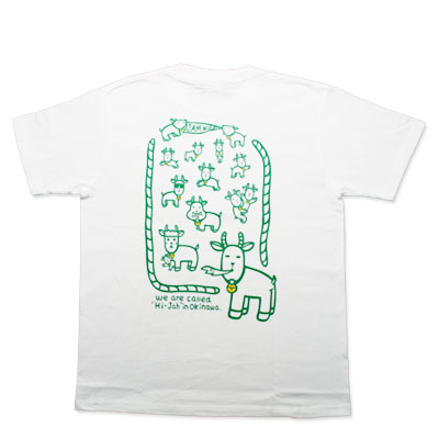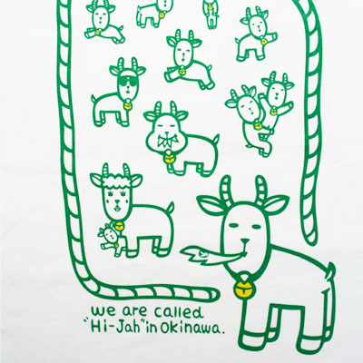 JAM MARKETで人気のTシャツの「ヒージャー」。フロントのボーッとしたヒージャーが可愛く、バックには、たくさんのヒージャーがいる愉快なTシャツです。親子でお揃いもオススメです!!※沖縄の方言でヤギの事を「ヒージャー」と言います。
