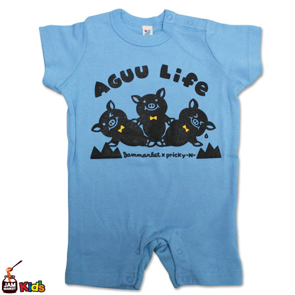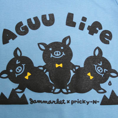 沖縄で活躍するイラストレーター「プリッキーNー(ヌー)」とのコラボTシャツ「アグー」。アグーとは今から600年前に中国から沖縄に渡って来たと言われている在来種と呼ばれている黒豚です。沖縄では高級食材ともされています。そんなアグーがTシャツにいっぱい出現!!ストレッチをしてたり、昼寝をしているアグーがいたりと愉快です!!大人用もありますので親子でお揃いもオススメです!!