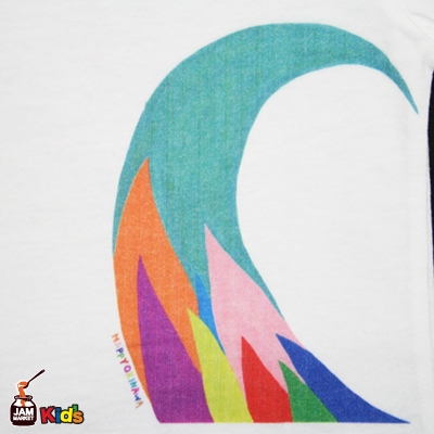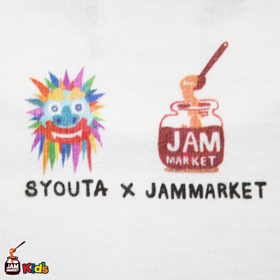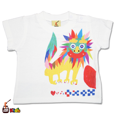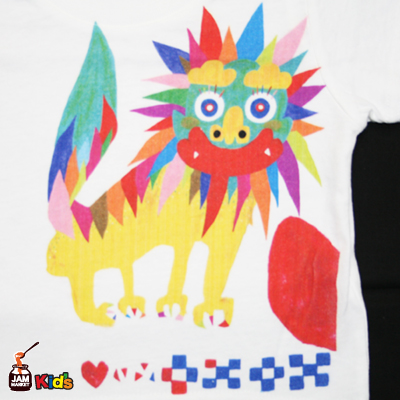 カラフルな色合いにインパクトのある可愛らしいシーサー !!!JAM MARKET×SYOUTA のコラボ作品が登場 !!!口を開けている男の子シーサーと、口を閉じている女の子シーサーの二種類があり、絵柄が繋がるLOVELYな1枚 !!!デザイン下部のトリコロールカラーのミンサー柄も繋がります。そして、なんとバックの尻尾のデザインも互いの立ち位置を変えるとハートのマークが !