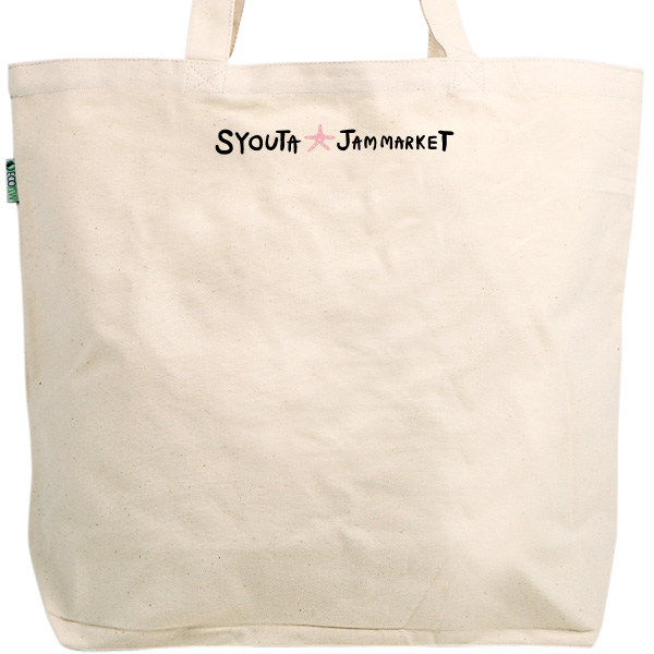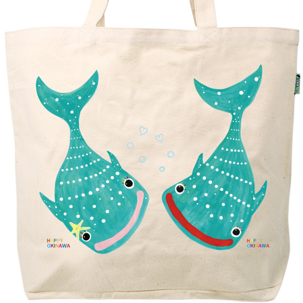男の子ジンベエと女の子ジンベエが向かい合っているかわいらしいバッグです。大きめのバッグなのでお買い物時のエコバッグとして便利です。