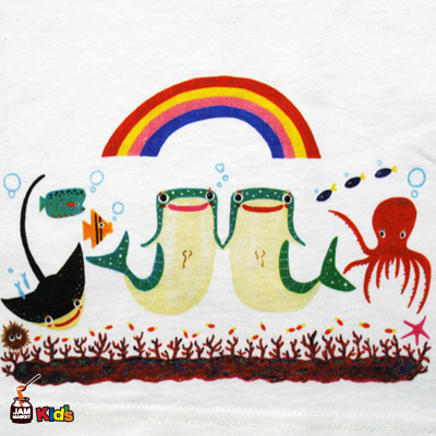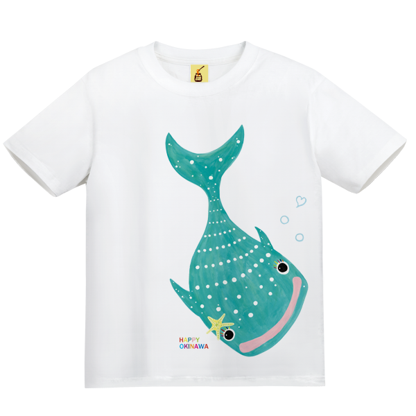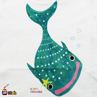 沖縄で活躍するアーティストSYOUTAとのコラボTシャツ。前面に大きなジンベエザメ。背面にはたくさんの海の生き物たちがいます。男の子ジンベエはジンベエザメのイラストを男の子っぽく。女の子ジンベエは頭にヒトデでリボンを付けてるようにしたデザインになっています。