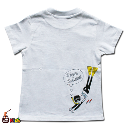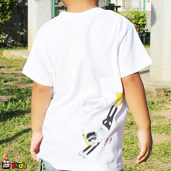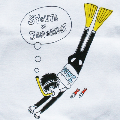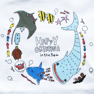 沖縄で活躍するアーティストSYOUTAとのコラボTシャツ。海の生き物をテーマでデザイン。ジンベエザメ、マンタ、マンボウといった魚達が優雅に泳いでいます。背面にはダイバーいます。