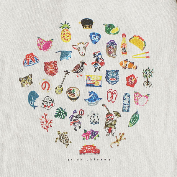 沖縄のモノがたくさんデザインされていて、紅型の色調で表現され、沖縄感が溢れているデザインとなっています。