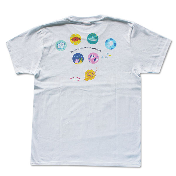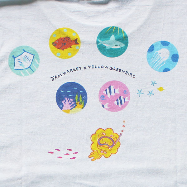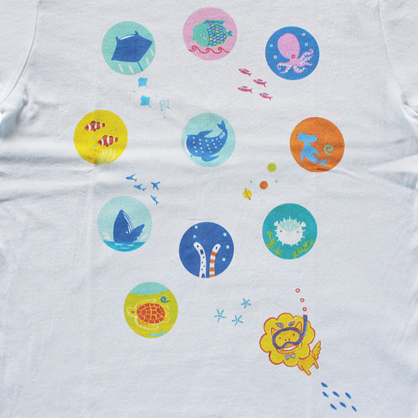 海の生き物たちとシーサーが仲良く泳いでいます。