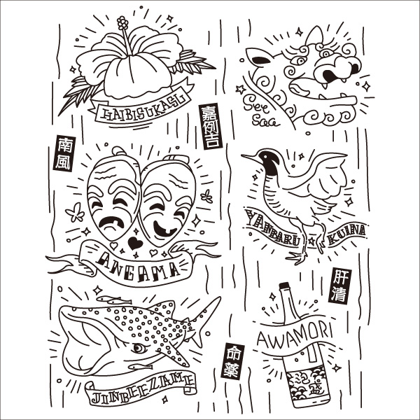 沖縄で目にするモノをアメリカンチックにデザイン。デザインの中には漢字があり、読み方が難しいです(笑)