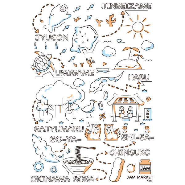 沖縄を旅して見たいモノ、食べたいモノを詰め込んだデザイン。イラストのタッチや色使いが昭和のファンシーショップを連想させます。背面のジンベエザメもカワイイ!!
