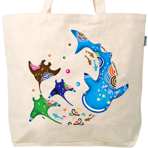 沖縄の海は南国ならではの珍しい生き物が数多く生息しています。海の中を覗いてみると美しい珊瑚礁や、ジンベエザメやマンタ、沢山の魚達が楽しそうに泳ぐ情景が浮かんできます。その様子を紅型風にデザインしました。