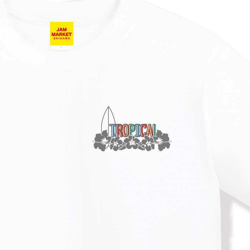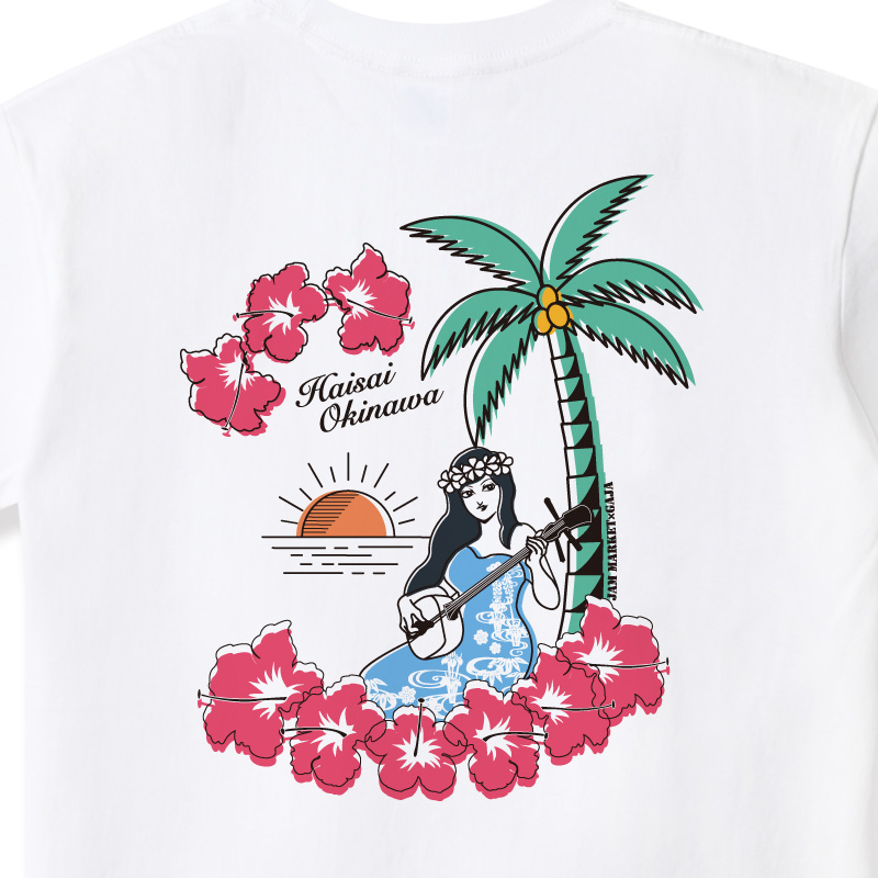背面に沖縄柄のワンピースを着た女性が海辺のハイビスカスに囲まれて三線を演奏している南国感あふれるデザインです。