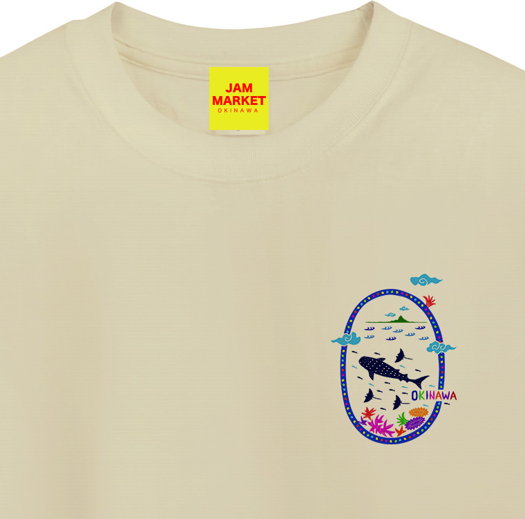 背面にダイバーがジンベエザメ、海の生き物たちとダイビングをしている