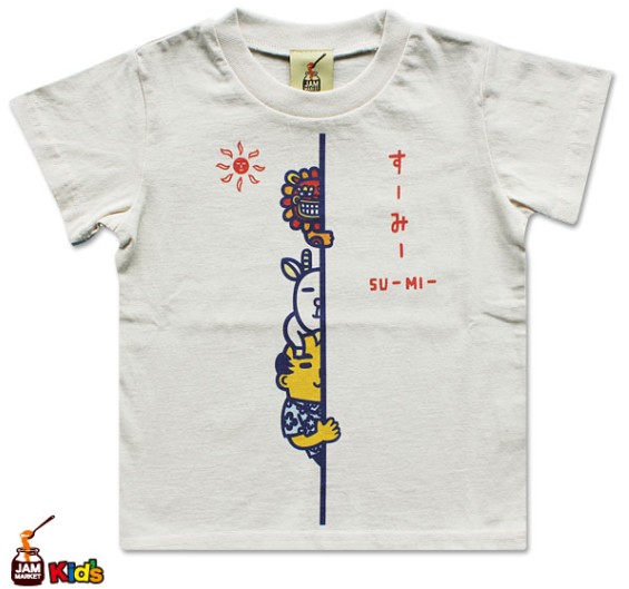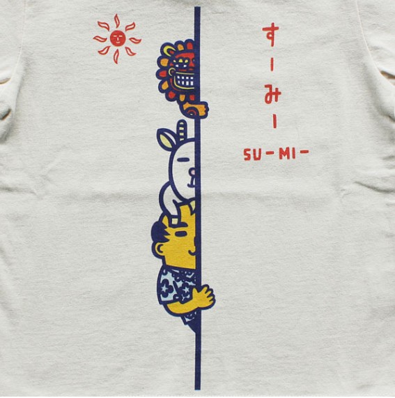 シーサー、ヒージャー(ヤギ)、かりゆしのおじさんがすーみーをしています。クスッと笑える1枚!!背面にはデザイナーのプリッキー山田がすーみーしています!!